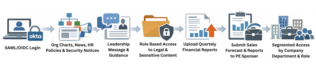 Employees at portfolio companies could log in securely using Okta through SAML or OIDC and access relevant communications, policies, reporting tools, and shared documents. The PE firm and leadership teams could also push targeted updates to the right employee groups while preserving strong access controls.